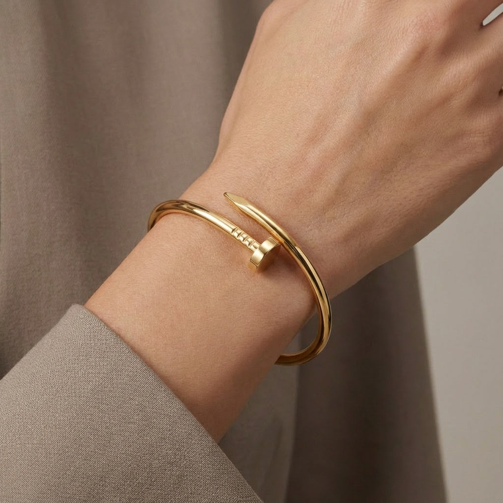 The Elegance Nail Bracelet in Gold is the epitome of sleek sophistication. Its minimalist nail-inspired design offers modern elegance with a touch of edge. The deluxe edition, featuring shimmering zircons, brings a burst of sparkle, making this bracelet the perfect statement piece for those who love a little extra luxury.