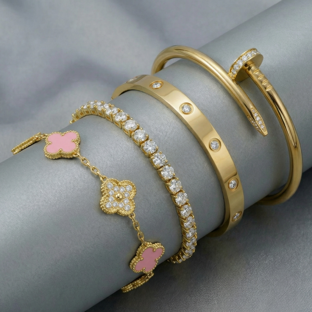 • Trinity & Clover Bracelet: A delicate and adjustable bracelet (16+5 cm) with charming details, available in gold or silver.