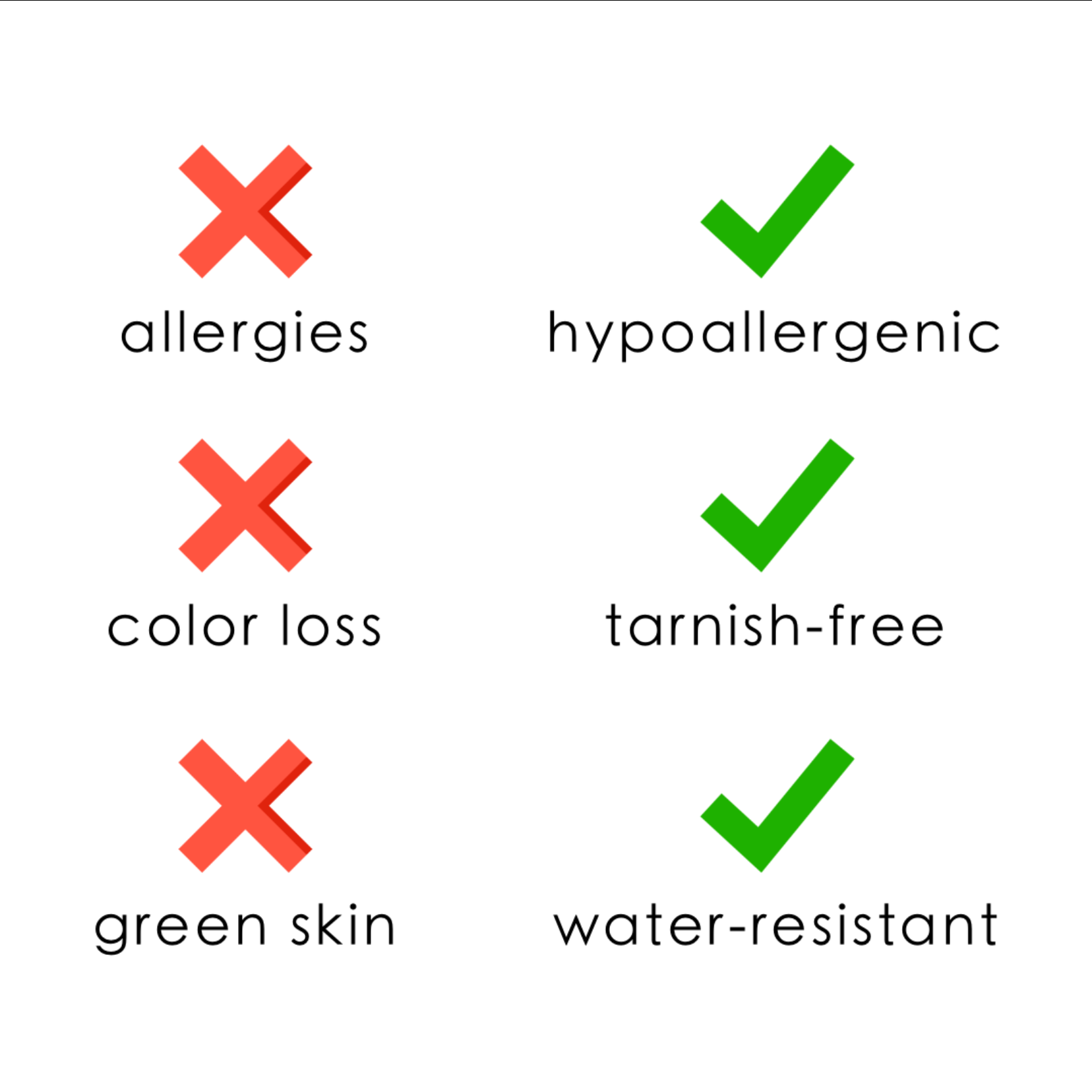 • Water, Sweat, and Heat Resistant. (No discoloration, No Tarnishing).