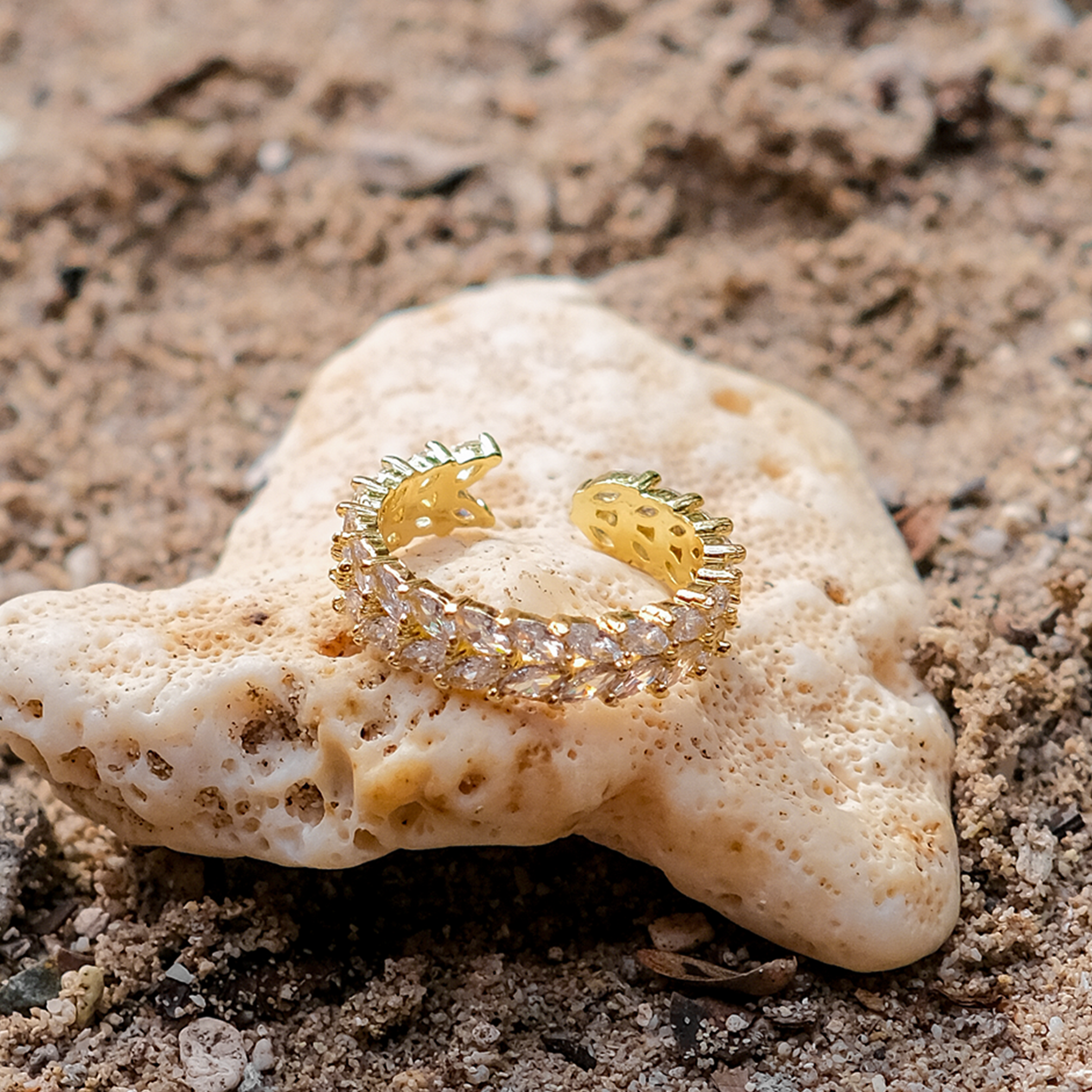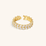 Clarisse is a stylish and sophisticated piece of jewelry that adds a touch of glamour to your look. It features a gold band with an open-ended design embedded with diamond simulants that sparkle like diamonds.